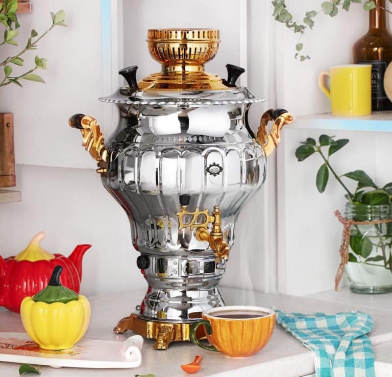 سماور گازی برنجی عالی نسب 6 لیتری پیلوت دار نگار نفیس طلایی